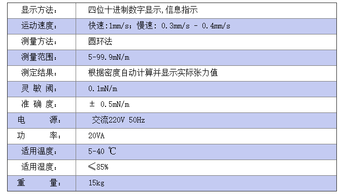 儀器符合GB/T6541的標(biāo)準(zhǔn),采用圓環(huán)法在非平衡的條件下測量各種液體表面張力(液—氣相界面)及礦物油與水的界面張力(液—液相界面)。該儀器采用了微處理技術(shù),自動化程度高、操作簡便、工作可靠。被測樣品注入杯后,只要按動啟動鍵,儀器便可自動完成對試樣的測量,并能自動根據(jù)輸入的具體參數(shù)計算出被測試樣的張力值。